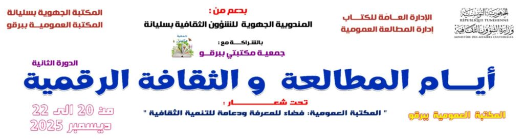 10 تحت شعار “المكتبة العمومية: فضاء للمعرفة ودعامة للتنمية الثقافية” تنظّم جمعية مكتبتي ببرقو والمكتبة العمومية بالمكان وبفضائها وبدعم من: المندوبية الجهوية للشؤون الثقافية بسليانة من 20 إلى22 ديسمبر الجاري فعاليات الدورة الثانية لـ”الأيام المطالعة والثقافة الرقمية” ويتضمن البرنامج في يومه الاول المخصص للقصة الرقمية وبإشراف الأستاذ فرات منصوري تعريفها بالقصة الرقمية وبأدواتها وورشات في تحويل القصص الورقية إلى رقمية وفي استخدام تطبيقات رقمية من نوع StoryJumper وCanva وخلال اليوم الثاني تنتظم ورشات رقمية أخرى بإشراف الأستاذ فرات منصوري وهي ورشة “إثراء القصّة الرقميّة بواسطة الذّكاء الاصطناعي” وورشة “بعث قناة يوتيوب للأطفال” وورشة الرسم الرقمي ثم يتم عرض إنتاجات الأطفال وتوزيع شهادات المشاركة وفي اليوم الثالث ينتظم لقاء خاص بإعداد المشاريع الثقافية بإشراف الأستاذ عزيز بن دوة ومن خلال مداخلات حول تصميم المشاريع الثقافية وورشات في التخطيط وتحليل SWOT ثم تطبيقات رقمية لتصميم مشروع ثقافي تتوّج بنقاشها واختتام التظاهرة. الصحفي منصف كريمي