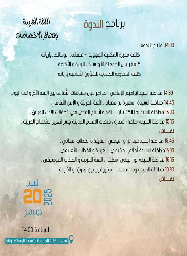 13 تنظّم الجمعية التونسية للتربية والثقافةبالاشتراك معالمكتبة الجهوية متعددة الوسائط بأريانة 📚 ندوة فكرية حول:اللغة العربية وتضافر الاختصاصات وذلك في إطار الاحتفال بـ🌍 اليوم العالمي للغة العربية (14 ديسمبر) 📅 السبت 20 ديسمبر 2025🕑 ابتداءً من الساعة 14:00📍 فضاء المكتبة الجهوية متعددة الوسائط – أريانة 🔹 برنامج الندوة: 14:00 – افتتاح الندوة كلمة مديرة المكتبة الجهوية متعددة الوسائط بأريانة كلمة رئيس الجمعية التونسية للتربية والثقافة كلمة المندوبية الجهوية للشؤون الثقافية بأريانة 14:30 مداخلة السيد إبراهيم الرفاعي:خواطر حول تشوّهات الثقافة بين اللغة الأم ولغة اليوم 14:45 مداخلة السيدة سميرة بن مصباح:اللغة العربية والأمن الثقافي 15:00 مداخلة السيد رضا الكشتبان:اللغة واتساع المدى في تحوّلات الأدب العربي 15:15 مداخلة السيدة سلمى قصارة:منصّات الإعلام الحديثة: جسر لتعزيز استخدام العربية 🔸 نقاش 15:45 مداخلة السيد عبد الرزاق الحملي:العربية والخطاب الغنائي 16:00 مداخلة السيدة أحلام الحكيمي:العربية والخطاب التعليمي 16:15 مداخلة السيدة نور الهدى اسكندر:اللغة العربية والخطاب الموسيقي 16:30 مداخلة السيدة وداد محمد:الميكروفون بين العربية والدّارجة 🔸 نقاش وختام الندوة نيابوليس الثقافية