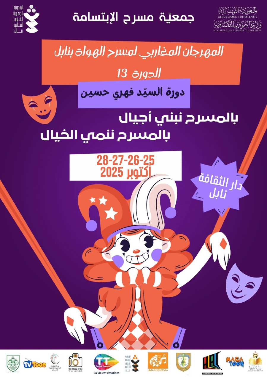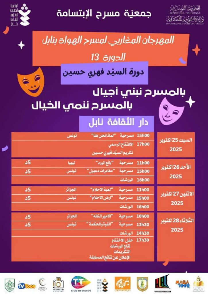 62 تنظم جمعية مسرح الابتسامة بنابل بدولة تونس فعاليات المهرجان المغاربي لمسرح الهواة بنابل، وذلك تحت رعاية وزارة الشؤون الثقافية وبإشراف المندوبية الجهوية للشؤون الثقافية بولاية نابل، خلال الفترة الممتدة من 25 إلى 28 أكتوبر 2025.تحمل هذه الدورة، وهي الدورة الثالثة عشرة، اسم دورة السيد فهري حسين، وتقام تحت شعار:«بالمسرح نبني أجيالًا… وبالمسرح ننمي الخيال». وستكون هذه الدورة مخصصة لمسرح الطفل، وتحتضنها دار الثقافة نابل.وحسب البرنامج الذي نشرته إدارة المهرجان، سيكون الافتتاح الرسمي يوم السبت القادم بعرض مسرحية “بائع الورد“، يتخلله تكريم السيد فهري حسين. وسيستمتع الأطفال طيلة أيام التظاهرة بالعروض المسرحية المبرمجة يوميًا.أما الورشات الفنية، فسيتولى تأطيرها كلٌّ من: الأستاذ منجي اللملومي في ورشة التمثيل الإيمائي، والأستاذة غفران الصالحي في ورشة صناعة الدمى. وتتكون لجنة التحكيم من الأساتذة: فواز بن كريم، يحيى الدد، عبد اللطيف بوعلاق، والمدير الفني إكلي امداح ). كما سيستضيف فضاء حمامات فن وثقافة بعض العروض المسرحية من الدول المغاربية الثلاث المشاركة. أما حفل الاختتام فسيكون مخصصًا للإعلان عن نتائج الورشات ونتائج المسابقة إلى جانب التكريمات الرسمية. يُذكر أن مدير المهرجان هو الأستاذ خيري بن إبراهيم، رئيس جمعية مسرح الابتسامة بنابل. وتشهد هذه الدورة مشاركة كلٍّ من: تونس بخمس مسرحيات: لماذا نحن هنا، مغامرات دعبول، أرض الأحلام، القوة والحكمة، ومدينة الأحلام. الجزائر بمسرحيتين: لعبة الأحلام والأمير التائه. ليبيا بمسرحية واحدة: بائع الورد