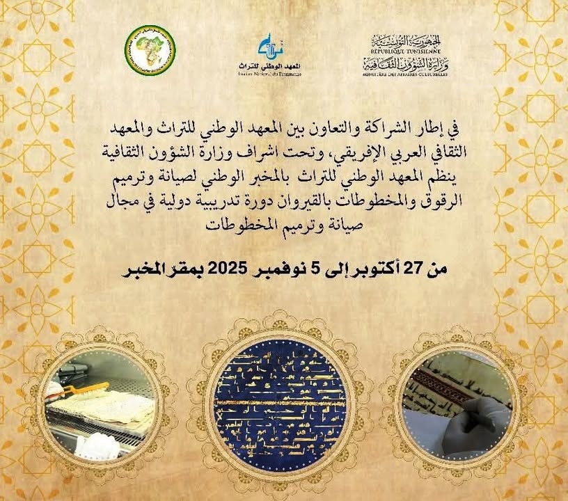 74 تحت اشراف وزارة الشؤون الثقافية وفي إطار الشراكة والتعاون بين المعهد الوطني للتراث والمعهد الثقافي العربي الإفريقي ينظم المعهد الوطني للتراث بالمخبر الوطني لصيانة وترميم الرقوق و المخطوطات بالقيروان دورة تدريبية دولية في مجال صيانة وترميم المخطوطات، وذلك من 27 أكتوبر الجاري إلى 5 نوفمبر القادم بمقرّ المخبر ومن خلال سلسلة من المحاضرات العلمية والورشات بإشراف نخبة من المختصين في المجال موجهة إلى متدربين من جنسيات عربية وإفريقية وخاص من دول بوركينافاسو، النيجر، الكوديفوار، مالي، غامبيا، السنغال، موريتانيا وليبياوتهدف هذه الدورة الى تبادل الخبرات والاطلاع على التجربة التونسية الرائدة في مجال صيانة وترميم المخطوطات، إلى جانب تعزيز العمل المشترك لحماية التراث العربي والإفريقي وصيانته