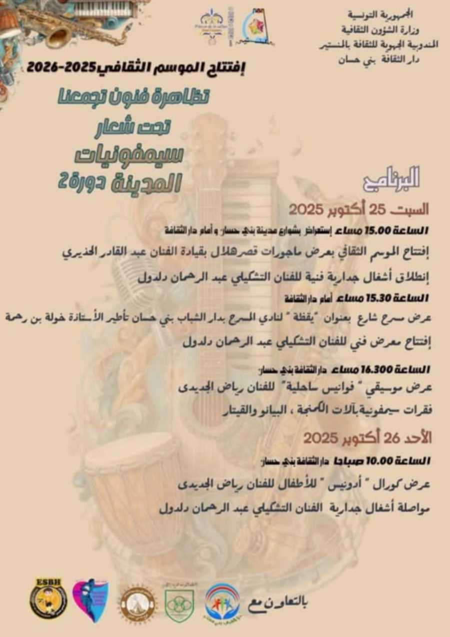 71 في إطار افتتاح الموسم الثقافي2025-2026 وتحت إشراف المندوبية الجهوية للشؤون الثقافية بالمنستير وبدعم منها تنظم دار الثقافة بنى حسان التي يديرها الأستاذ زياد حمايدى بالتعاون مع دار الشباب ومنظمة التربية والأسرة وفوج الكشافة وجمعية فتيات الرقبي وجمعية البرق الرياضي ببنى حسان وتحت شعار “سيمفونيات المدينة” فعاليات الدورة الثانية لتظاهرة “فنون تجمعنا“. وتفتتح هذه التظاهرة مساء اليوم من خلال عرض لماجورات قصرهلال للفنان عبد الرحمان دلدول وتقديم فقرات موسيقية سيمفونية في وسط المدينة والطرقات الرئيسية وأمام دار الثقافة بنى حسان ثم ينتظم استعراض “مسرح الشارع” من خلال عرض مسرحية “يقظة” لنادي المسرح لدار الشباب بنى حسان ومن تأطير الأستاذة خولة بن رحمة لينتظم إثر ذلك معرض فنون تشكيلية وجداريات فنية للفنان عبد الرحمان دلدول ثم معرض فنون تشكيلية للفنانة التشكيلية إخلاص الأسود فاختتام اليوم الاول من التظاهرة بعرض موسيقى فوانيس ساحلية للفنان رياض الجديدى وفقرات سيمفونية بآلات الكمنجة والبيانو والقيثارة ويكون الموعد غدا 26 أكتوبر الجاري في فضاء دار الثقافة بنى حسان مع عرض فني لكورال “أدونيس للأطفال” للفنان رياض الجديدى ثم مواصلة الجداريات فنية للفنان التشكيلي عبد الرحمان دلدول فتوزيع الشهائد على الأطراف المساهمة في نجاح هذه التظاهرة.