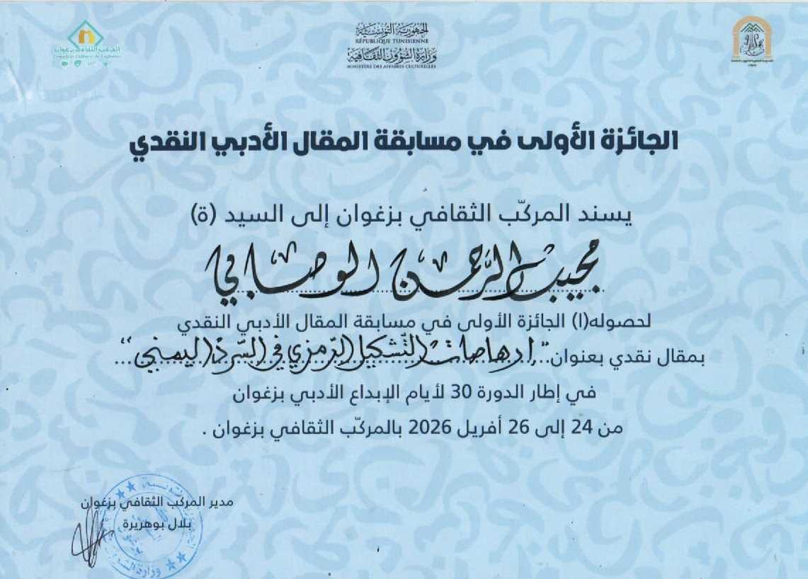 104 في إنجاز ثقافي نوعي يجسد الحضور اليمني في الساحة الأدبية العربية، تُوّج الباحث والأكاديمي اليمني الأستاذ مجيب الرحمن الوصابي بالجائزة الأولى في مسابقة المقال الأدبي النقدي، وذلك ضمن فعاليات الدورة الثلاثين لـ “أيام الإبداع الأدبي” التي أقيمت بالمركب الثقافي بولاية زغوان التونسية. وقد حظي هذا التتويج باحتفاء رسمي واسع، حيث أجرى وزير الثقافة اليمني، الأستاذ الأستاذ مطيع دماج، اتصالاً هاتفياً بالوصابي، عبّر فيه عن فخره بهذا المنجز، مثمناً في الوقت ذاته جهود الجهات المنظمة في تونس وخصوصا في زغوان على حسن الاستضافة وتوفير فضاء إبداعي يحتضن الطاقات العربية واليمنية، وأشاد بدور تونس الريادي في الثقافة والعلوم كما هنأ سعادة سفير الجمهورية اليمنية في تونس، الأستاذ عبدالناصر باحبيب، والمستشار الثقافي الدكتور مسلي بحيبح، الباحث الوصابي بهذا التميز. وأشادت السفارة في اتصالها بالدور الذي يلعبه الأكاديمي اليمني في مد جسور التواصل الثقافي، مؤكدين أن هذا الفوز يعكس عمق التجربة النقدية اليمنية وقدرتها على المنافسة والريادة في المحافل الدولية، وقد ثمن باحبيب وبحيبح الدور الذي تقوم به المؤسسات الثقافية الرسمية والأكاديمية في تونس. ويأتي هذا الفوز امتداداً لسجل حافل للباحث، إذ سبق لـ مجيب الرحمن الوصابي أن حصد الجائزة الأولى ذاتها في العام المنصرم عن مقالته “أشجار اليمن المقدسة”، مما يؤكد استمرارية تميزه وقدرته على تقديم مقاربات نقدية وعلمية عميقة نالت ثقة لجان التحكيم التونسية والعربية. من جانبه، أعرب الوصابي عن شكره وتقديره لوزارة الثقافة والسفارة اليمنية بتونس والجهات المنظمة ودعمهم وتشجيعهم المستمر، مؤكداً أن ملتقى زغوان يمثل فرصة استراتيجية لتبادل الخبرات عبر ورش العمل والندوات التي تسهم في صقل الأدوات النقدية لدى الباحثين العرب والمبدعين يُذكر أن الباحث مجيب الرحمن الوصابي يعمل يحاضر في كلية الآداب بجامعة عدن منذ عام 2000، والجامعة اللبنانية الدولية ويمتلك مسيرة ثرية كمدرب وطني وخبير في التراث والفلكلور الشعبي. وقد عُرف بنشاطه الإعلامي المكثف في أبرز الصحف العربية (التونسية، المصرية، السعودية، والعراقية)، مما جعله يستحق لقب “سفير الإبداع العربي” تقديراً لإسهاماته التي تتجاوز الحدود الجغرافية لترسم ملامح الهوية الثقافية الجامعة. و تتقدم أسرة فريق عمل (أصداء الساعة) بأحرّ التهاني والتبريكات للباحث اليمني الدكتور مجيب الرحمن الوصابي، بمناسبة فوزه المستحق بالجائزة الأولى، مشيدةً بما يقدّمه من إسهامات علمية وأدبية مشرّفة تعكس حضور الإبداع اليمني في المحافل العربية. المراسل / الباحث مجيب الرحمن الوصابي