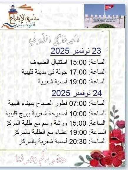 74 🎭 جمعية منارة الإبداع التونسية بالشراكة مع ⚓ المركز القطاعي للتكوين المهني في الميكنة البحرية بقليبية تنظّم يوماً ثقافياً مع طلبة المركز وذلك يوم الاثنين 24 نوفمبر 2025 📚 يتضمّن البرنامج: 🎨 ورشة رسم مع الفنان العراقي سمير البياتي ✍️ أمسية شعرية مع الشاعر المغربي الجزار الأنيق وثُلّة من شعراء الجهة المبدعين 📍 المكان: المركز القطاعي للتكوين المهني في الميكنة البحرية – قليبية ✨ دعوة مفتوحة لعشّاق الفنّ والشعر والإبداع ✨