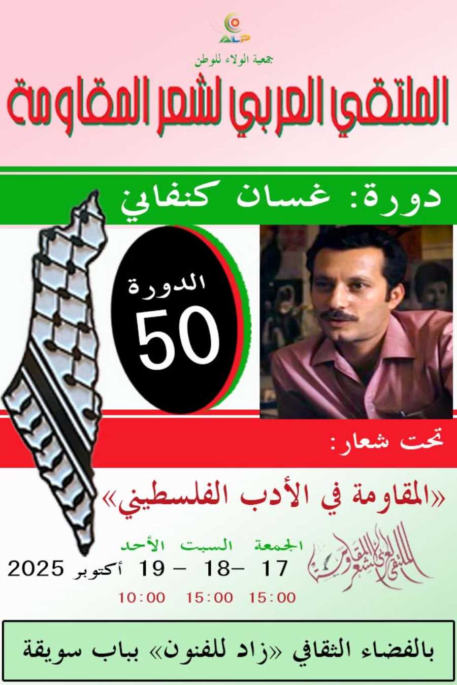جمعية الولاء للوطن-تونس: الدورة 50 للملتقى العربي لشعر المقاومة دورة “غسان كنفاني” من 17 إلى 19 أكتوبر 2025