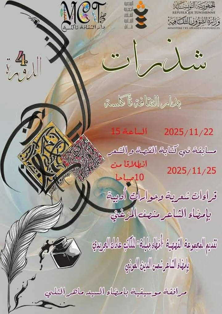261 🎤 إعــلان تظاهرة “شَذَرَات” يسرّنا إعلامكم بأنّ تظاهرة “شذرات” ستنتظم يوم 25 نوفمبر، بدار الثقافة تاكلسة وهي مساحة فنّيّة وثقافيّة تحتفي بالإبداع في مختلف تجلّياته وتجمع بين الكلمة والصوت والصورة في لحظةٍ واحدة من التألّق. تتضمّن التظاهرة: ✨ عروضًا فنّيّة متنوّعة ✨ فقرات قراءات شعرية وقصصية ✨ فضاءً للنقاش والتفاعل مع المبدعين✨ معرضًا مصغّرًا للأعمال الفنية وذلك بحضور نخبة من المبدعين والمهتمين بالشأن الثقافي. 📅 التاريخ: 25 نوفمبر📍 المكان: (دار الثقافة تاكلسة)⏰ التوقيت: (10:00) العاشرة صباحا الدعوة مفتوحة لكلّ محبّي الثقافة والفن كونوا في الموعد لنقتسم معًا شذرات من الجمال والإبداع. بقلم أحمد بالشيخ
