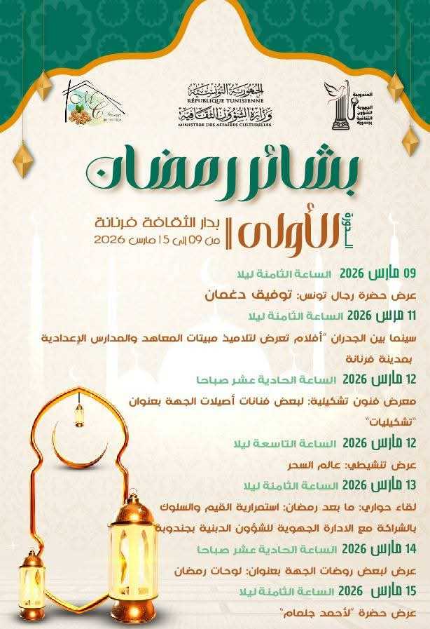 150 تحتضن دار الثقافة بفرنانة فعاليات الدورة الاولى لتظاهرة “بشائر رمضان“، وذلك من 09 الى 15 مارس 2026، تحت اشراف وزارة الشؤون الثقافية، في موعد ثقافي يزاوج بين روحانية الشهر الفضيل واشراقات الابداع الفني والفكري. وتأتي “بشائر رمضان” لتفتح فضاء رحبا للتلاقي الثقافي والابداعي، عبر برنامج متنوع يجمع بين العروض السينمائية، والمعارض الفنية التشكيلية، والعروض التنشيطية، الى جانب اللقاءات الفكرية والحوارية التي تستحضر القيم الرمضانية في بعدها الانساني والثقافي، وتؤكد الدور الحيوي للمؤسسات الثقافية في ترسيخ هذه القيم داخل المجتمع. كما تمثل “بشائر رمضان” نافذة مضيئة لإبراز طاقات الجهة ومبدعيها، من فنانين ومثقفين وشباب، في إطار ديناميكية ثقافية تسعى الى تنشيط الفضاء الثقافي وتعزيز حضوره في الحياة العامة، خاصة خلال ليالي الشهر الكريم التي تظل فضاء للقاء والتبادل والجمال. ومن خلال هذه التظاهرة، تراهن دار الثقافة بفرنانة على ان تكون “بشائر رمضان” تقليدا ثقافيا سنويا متجددا، يحمل في كل دورة بشائر الابداع ويجدد الصلة بين الثقافة وروح رمضان، في تلاق يضيء ليالي الجهة بأنوار الفن والفكر والحياة. الصحافية عبير الغزواني
