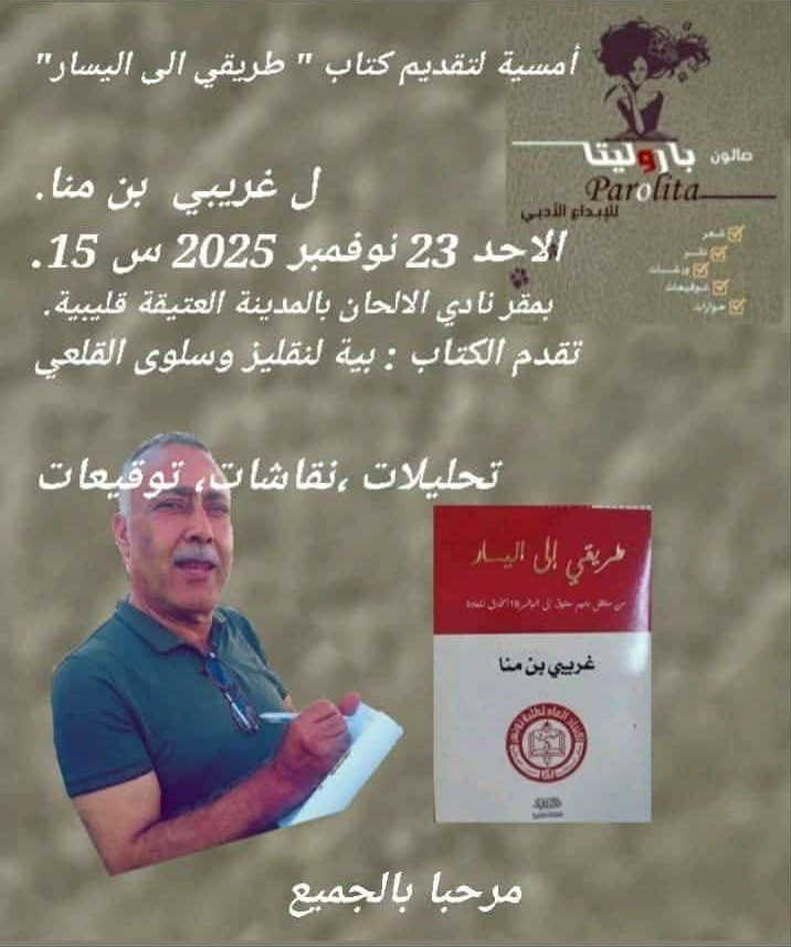 152 📚 قليبية الأدب والفنون 🎨 تتشرف بدعوتكم هذا الأحد على الساعة الثالثة بعد الظهربفضاء سيدي عبدالسلام – قليبيةلللقاء مع الأستاذ غريبي بن مناحول منجزه:📘 “طريقي إلى اليسار” وذلك بمساهمة وتقديم الأستاذتين:✨ سلوى الڤلعي✨ بيّة الانڤليز بعد اللقاء الأدبي، يمكن للحضور زيارة معرض الفن التشكيلي:🎨 “بحرنا 1”برواق الفنون بدار الثقافة قليبية. مرحبا بكم جميعاً في هذا الموعد الثقافي المميّز.