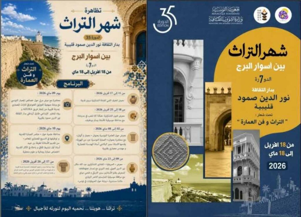 172 في إطار الدورة الخامسة والثلاثين لشهر التراث، تحت شعار “التراث وفنّ العمارة”، وذلك من 18 أفريل إلى 18 ماي 2026، تنظم دار الثقافة نور الدين صمود بقليبية تظاهرة “بين أسوار البرج” في دورتها السابعة، وذلك بالتعاون مع جمعية قليبية للثقافة والتراث والفنون والمختبر الإبداعي طارق كردغلي، وذلك بفضاء دار الثقافة نور الدين صمود بقليبية. ✨ تظاهرة ثقافية تحتفي بالموروث الحضاري والمعماري لمدينة قليبية، وتفتح المجال أمام الجمهور لاكتشاف جمال التراث المحلي من خلال برنامج ثري ومتنوّع يجمع بين المعارض، والورشات، واللقاءات الفكرية، والأنشطة الفنية والثقافية. 📍 المكان: دار الثقافة نور الدين صمود بقليبية📅 التاريخ: من 18 أفريل إلى 18 ماي 2026 📣 كونوا في الموعد للاحتفاء بذاكرة المكان، وسحر التاريخ، وجمال العمارة، في مدينة تجمع بين أصالة الماضي ونبض الحاضر. أحمد بالشيخ