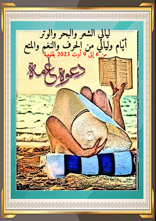 891 بالشراكة بين جمعيّة مراجعات ثقافيّة و جمعيّة منارة الأدب بقليبية تنتظم من 6 إلى 9 أوت 2023 تظاهرة ليالي الشعر والبحر والوتر. في دورتها الثالثة على التوالي (2021 و 2022 وهذه الدورة 2023) حسب البرنامج التالي: 6 أوت: س 18 المساء: لقاء مع القاص منير صالح الجابري ومجموعته القصصية (حكايات غرقى). بفضاء مقهى بوزار السهرة: س20.30 تنطلق مع معرض تشكيلي لفنانين من قليبية بفضاء سيدي عبد السلام يليه سهرة فنية يحييها فريق نادي الالحان بقليبية بقيادة الأستاذ يوسف القريتلي. 7 أوت: س 18 لقاء مع الروائي الأستاذ محمد البلاجي وروايته (شعاع في الظلمة) بفضاء مقهى بوزار بقليبية العتيقة. السهرة: س21 شعريّة بفضاء مقهى سيدي البحري. 8 أوت: س 18 اللقاء مع الشاعرة منى الماجري ومجموعتها الشعريّة (ما رشح من شقوق الخوابي) بفضاء بوزار بقليبية العتيقة. السهرة: س 21. شعريّة بفضاء المسلك السياحي بقليبية. 9 أوت: مجلس صباحي بمقهى الميناء لتسليم شهائد المشاركة والتكريمات والإعلان عن انتهاء التظاهرة