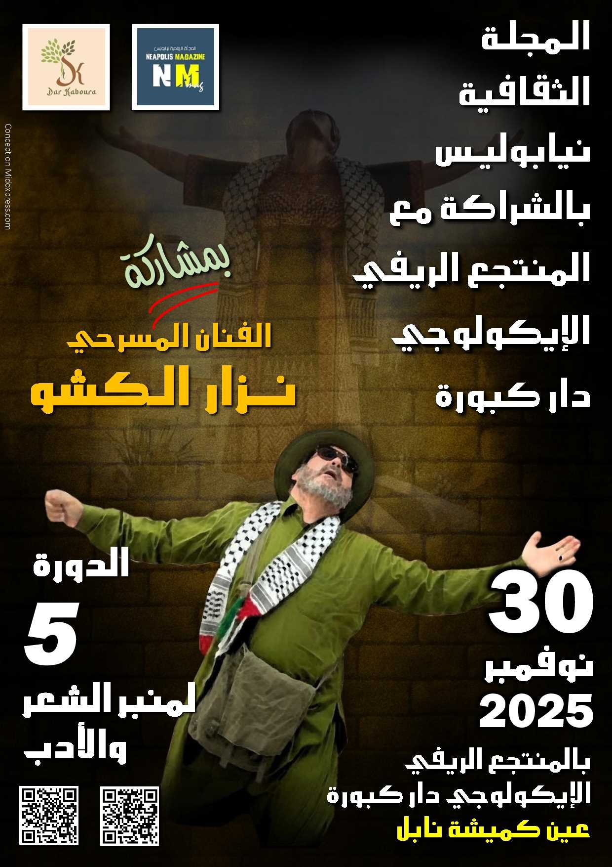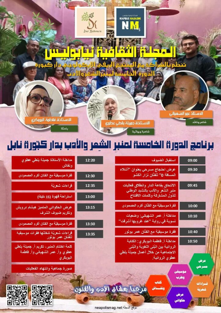 274 تتجدّد المواعيد الثقافية في ولاية نابل مع تظاهرة أدبية باتت جزءًا من المشهد الثقافي المحلي، حيث تنظّم المجلّة الرقمية نيابوليس بالشراكة مع المنتجع الريفي الإيكولوجي دار كبّورة يوم الأحد 30 نوفمبر 2025 فعاليات الدورة الخامسة من “منبر الشعر والأدب”، وذلك تحت عنوان:“تمثّلات المرأة في الرواية… مفتاح لقراءة المجتمع”. ويهدف هذا الموعد الأدبي إلى تعزيز الحوار حول حضور المرأة في المتخيّل الروائي ودورها في قراءة البنى الاجتماعية، مع التركيز على تجربة الروائية والشاعرة جميلة بلطي عطوي التي تشكّل محور هذه الدورة. برنامج ثقافي متنوّع يجمع بين النقد والفنون الأدائية تنطلق الفعاليات ابتداءً من الساعة التاسعة صباحًا بدار كبّورة – نابل، على أن يبدأ البرنامج رسميًا في التاسعة والنصف بعرض مسرحي للفنان نزار الكشو، المعروف بإبداعه في مسرح الشارع وقدرته على ملامسة المواضيع الإنسانية المعاصرة. ويلي ذلك تقديم موسّع لأعمال الروائية جميلة بلطي عطوي، تمهيدًا لسلسلة من المداخلات النقدية حول “النسيج الاجتماعي في رواياتها”، من بينها: مداخلة الأستاذ عمر الشهباني بعنوان: “وضعيات نسوية في رواية عند غروبها أشرقت”. مداخلة الأستاذة فاطمة البوبكري بعنوان: “الكتابة الروائية بين البنى اللغوية والبنى الاجتماعية من خلال أعمال جميلة بلطي عطوي الروائية”. كما يفتح المنبر الباب للنقاش المفتوح بين الجمهور والمشاركين، قبل الانتقال إلى استراحة قهوة. بين الحكواتي والشعر والموسيقى… فسيفساء فنية تحت سقف واحد ويواصل البرنامج فقراته بعرض حكواتي يقدّمه الفنان هشام درويش، ثم يعود إلى أجواء الشعر عبر قراءات متنوّعة، في حين يُضفي الفنانان أكرم المصمودي وعمر بوثور لمستَين موسيقيتين تُثري الأجواء وتُكمل المشهد الإبداعي. تكريم ضيوف الشرف… وإعلاء لقيمة الفعل الثقافي وتختتم هذه الدورة بتكريم ضيوف الشرف، في بادرة تؤكّد إصرار المجلّة الرقمية نيابوليس على دعم الأصوات الأدبية والفنية وإشعاع الثقافة في الجهة. وتأتي هذه الدورة بإدارة الشاعر محمد هادي عون ومساعدة الروائية والشاعرة حنان الشلّي، استمرارًا لجهود تطوعية انطلقت منذ 2023 بهدف خلق فضاءات للحوار والإبداع وإبراز الطاقات الأدبية والفنية في نابل وجميع أنحاء الجمهورية. بقلم نيابوليس الثقافية