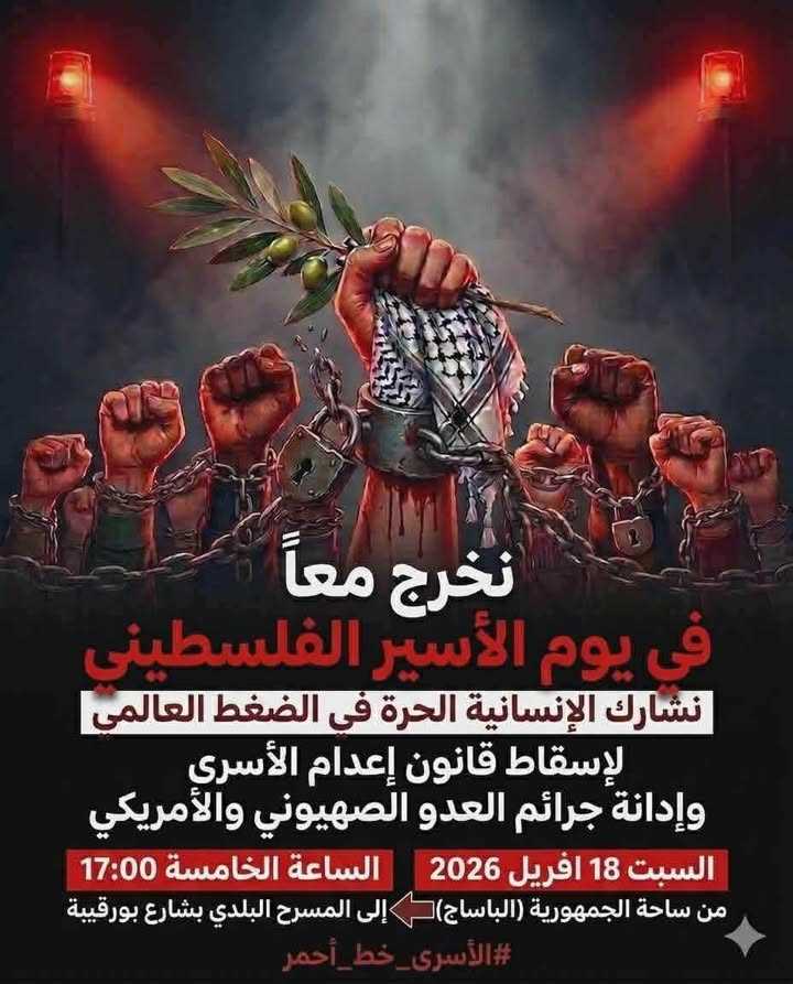 46 أعلنت “هيئة الصمود التونسية” انضمامها إلى الدعوة التي أطلقتها قوى داعمة للحق الفلسطيني في تونس للمشاركة في مسيرة تُنظَّم بمناسبة يوم الأسير الفلسطيني، وذلك للتعبير عن التضامن مع الأسرى الفلسطينيين والاحتجاج على الانتهاكات المرتبطة بقضيتهم. كما دعت الهيئة إلى المشاركة في هذا التحرّك المبرمج وسط العاصمة، مع التأكيد على ضرورة الالتزام بتوصيات لجنة التنظيم لضمان حسن سير المسيرة. وفي ما يلي نصّ البلاغ كما ورد: هيئة الصمود التونسيةيوم الأسير الفلسطينيننضم للدعوة التي أطلقتها القوى الحية الدعمة للحق الفلسطيني في تونس، وندعوكم للمشاركة في مسيرة يوم الأسير الفلسطيني“نخرج في مسيرة بمناسبة يوم الأسير الفلسطيني لنشارك الإنسانية الحرة التي تضغط لأجل إسقاط قانون إعدام الأسرى و احتجاجاً على جرائم العدو الصه_يوني و الأمريكي “السبت 18 أفريلالساعة 17:00من ساحة الباساج باتجاه المسرح البلدييرجى الالتزام بتوصيات لجنة التنظيم لضمان نجاح التحرك المراسل أحمد بالشيخ